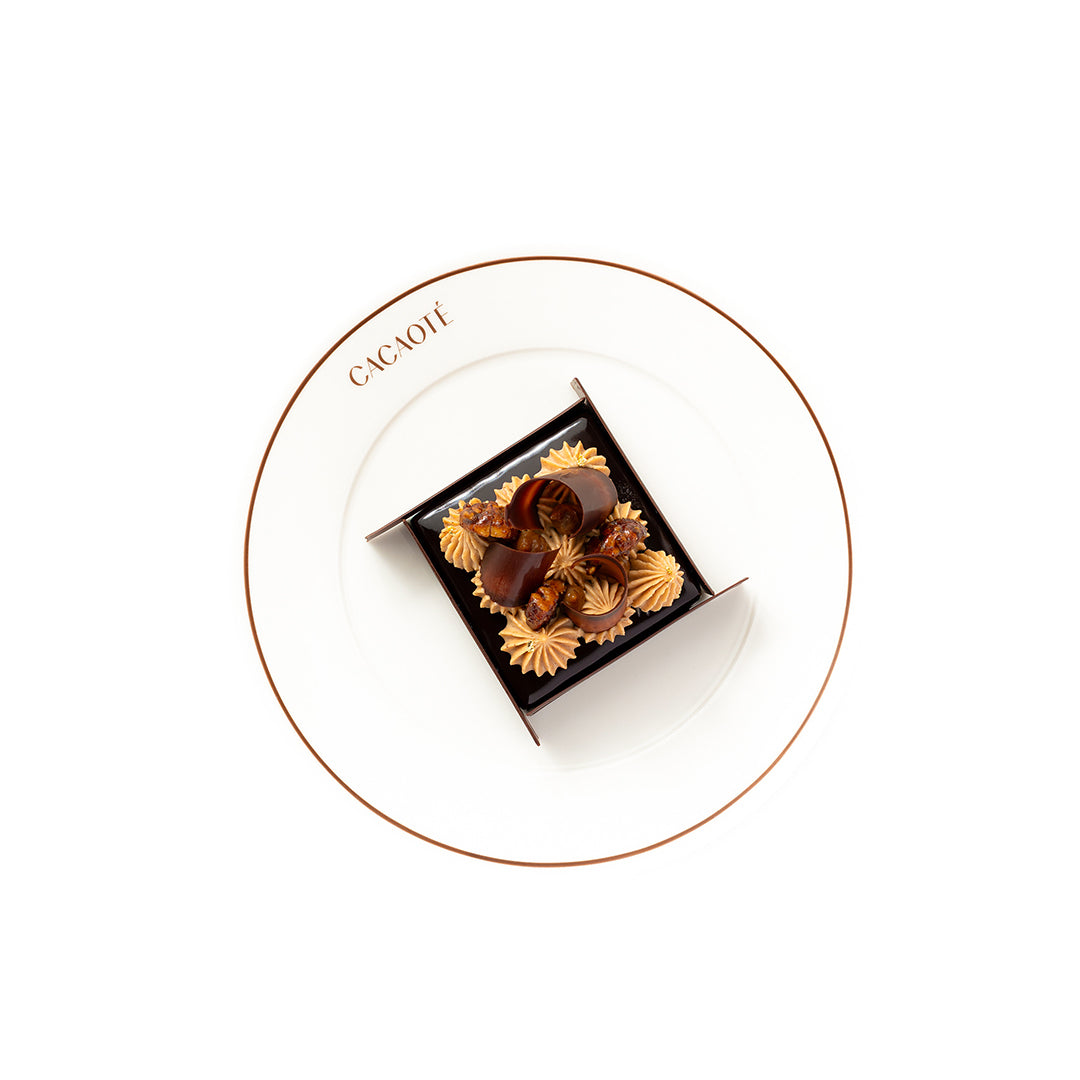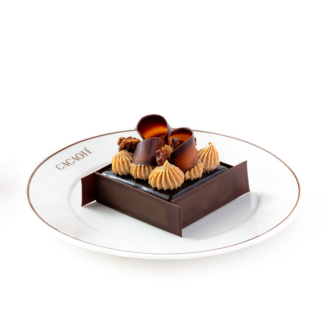 For chocolate lovers, the Chocolate Pecan Brûlée is a true masterpiece. A crisp dark chocolate streusel base holds layers of feuilletine pecan, rich chocolate ganache, and velvety chocolate crème brûlée. Glazed with dark chocolate and topped with pecan cream and caramel pecans, it’s a dessert to savour.