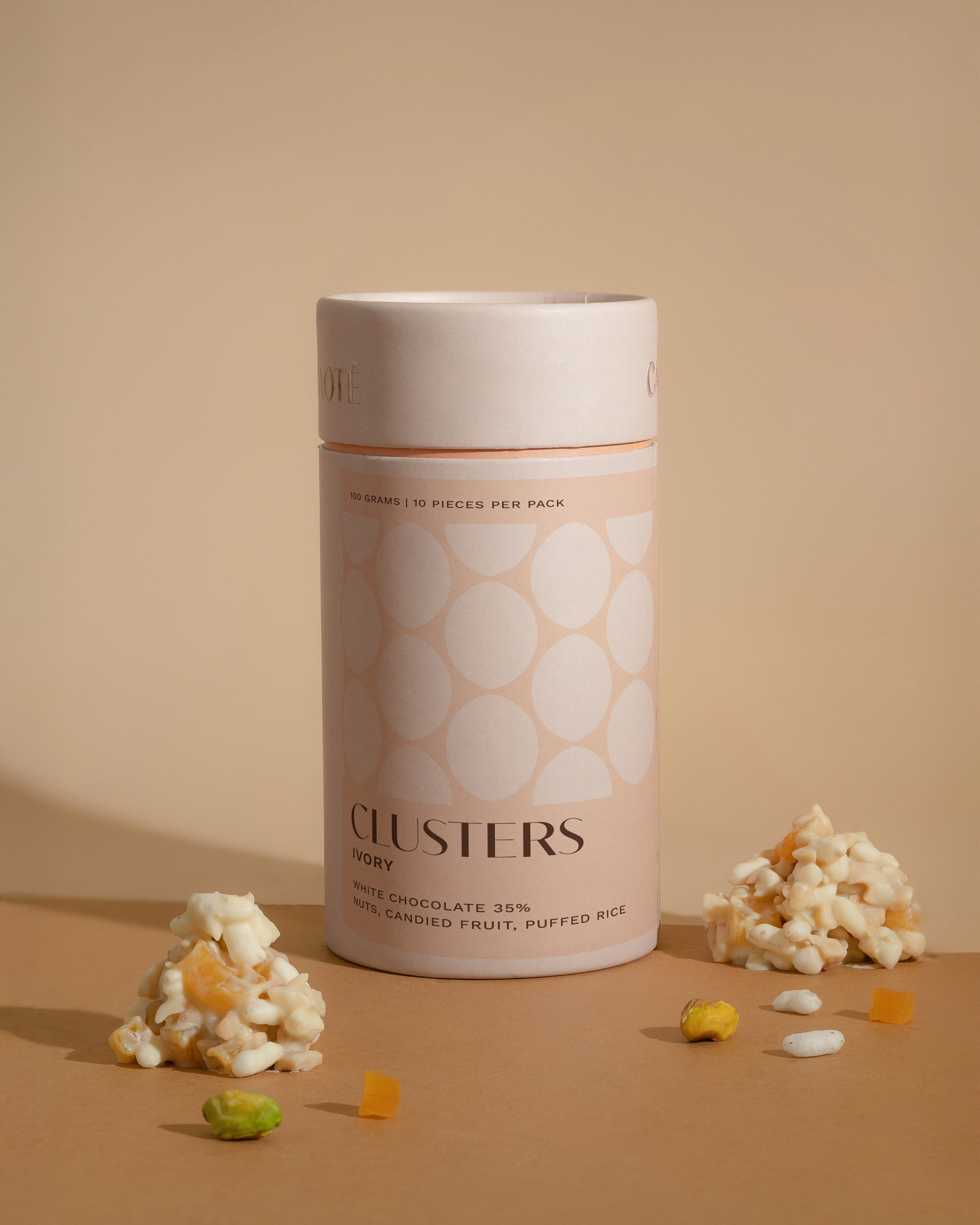 Nutty and fruity clusters with puffed rice, enrobed in 35% white chocolate.